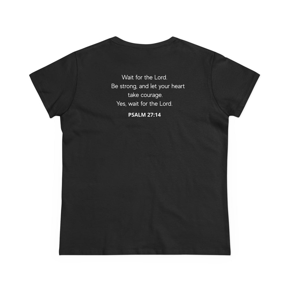 The full verse from Psalm 27:14 is displayed on the back, encouraging meaningful conversations about trusting God's plan. Wear it during challenging times for solace and encouragement. It's a powerful statement of faith and resilience. Perfect for spiritual upliftment or inspiring others.