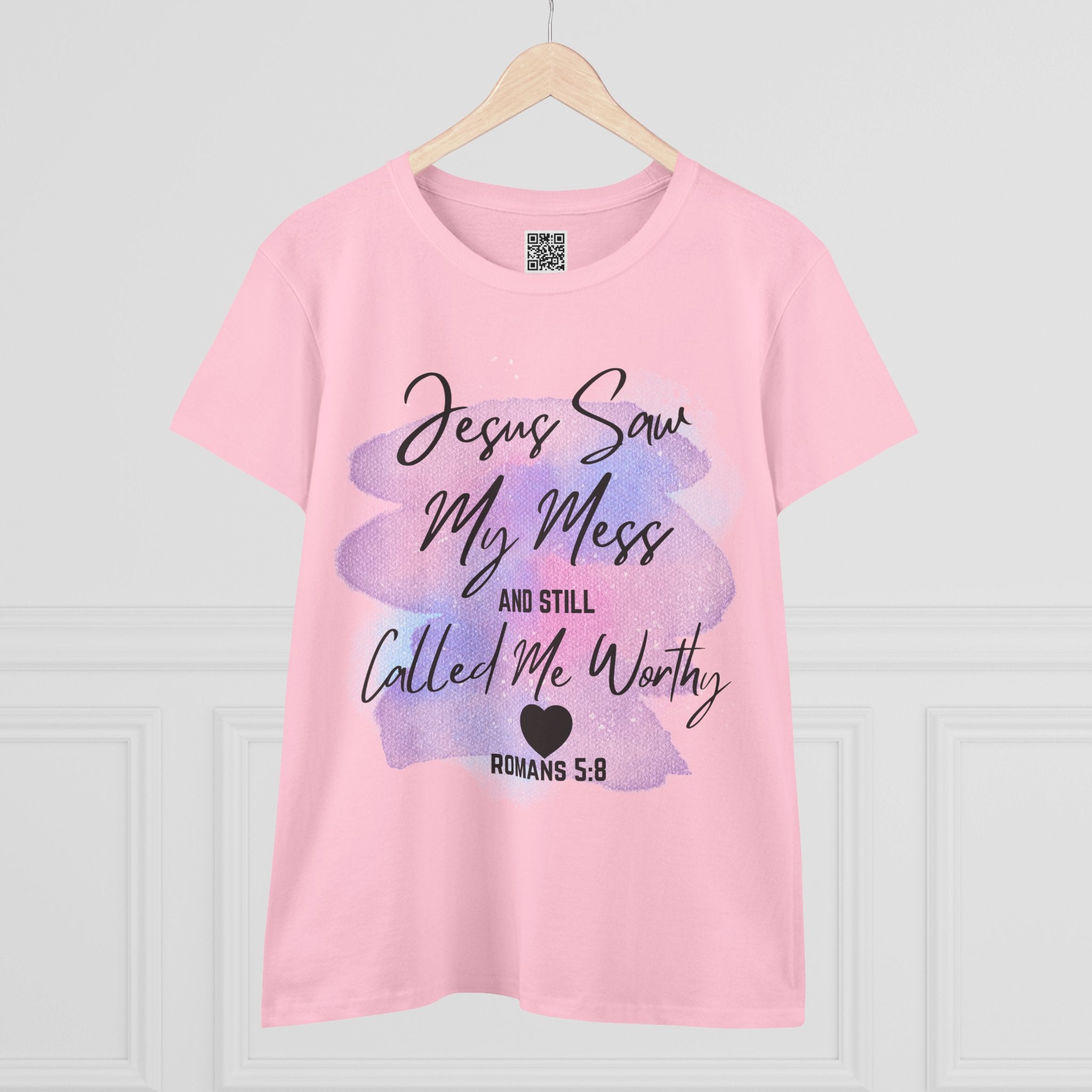 Embrace comfort and style while proudly expressing your unwavering faith with this Jesus Saw My Mess and Still Called Me Worthy 100% Cotton T-shirt. Crafted from premium cotton, this women's shirt delivers unmatched softness and durability, ensuring a comfortable fit for all-day wear. Featuring the empowering verse Romans 5:8 on the back, this shirt is not only a fashion statement but also a powerful declaration of faith and worthiness in Christ.