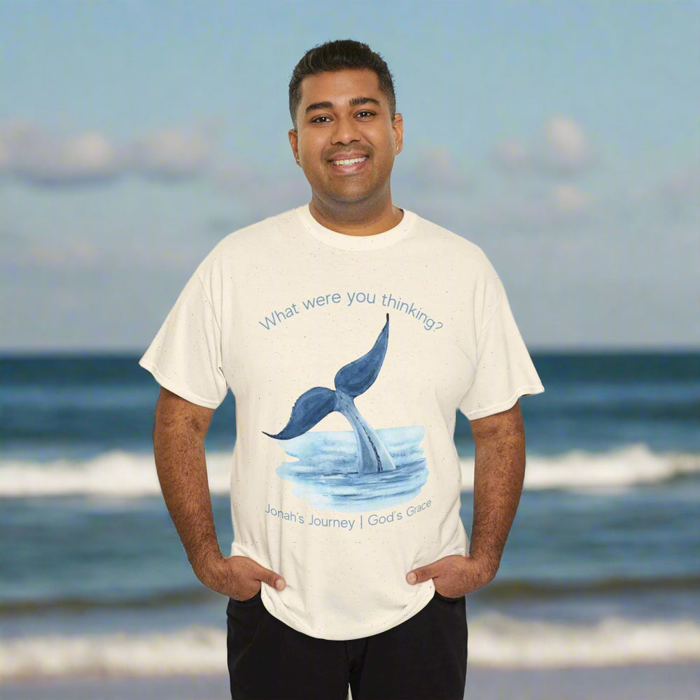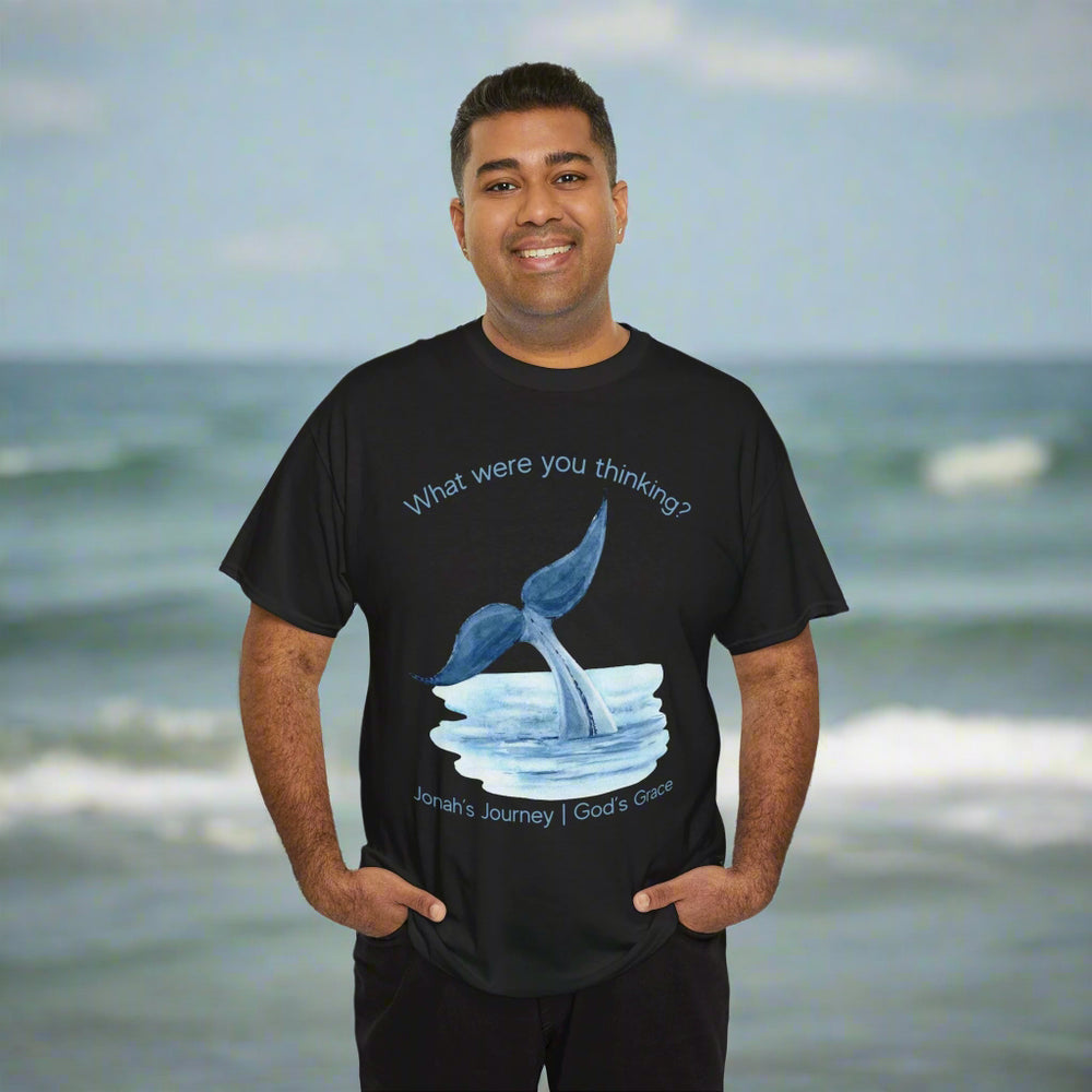Are you tired of plain t-shirts? Our "What Were You Thinking? Jonah's Journey I God's Grace" unisex t-shirt offers a striking design. It features a whale's tail, symbolizing Jonah's journey. The phrase "What were you thinking?" curves above the picture, while "Jonah's Journey I God's Grace" is below. This 100% cotton t-shirt is perfect for Christian gifts.